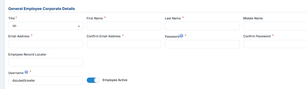 General Employee Corporate details allow you to change your general information such as title, name, username, email, and password: