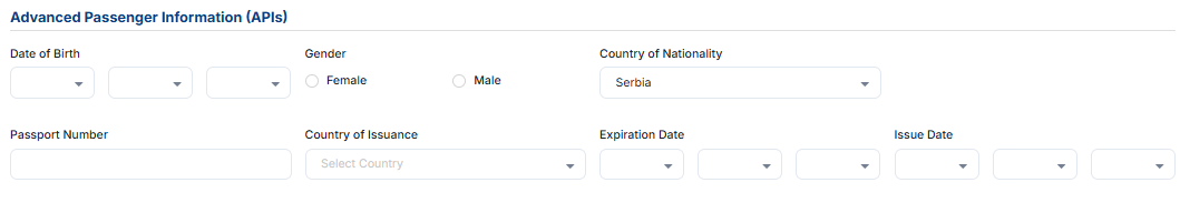 Advanced Personal Information (APIs) allows you to define the date of birth, gender, and country of nationality and to add passport information.