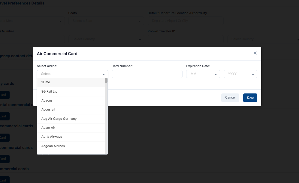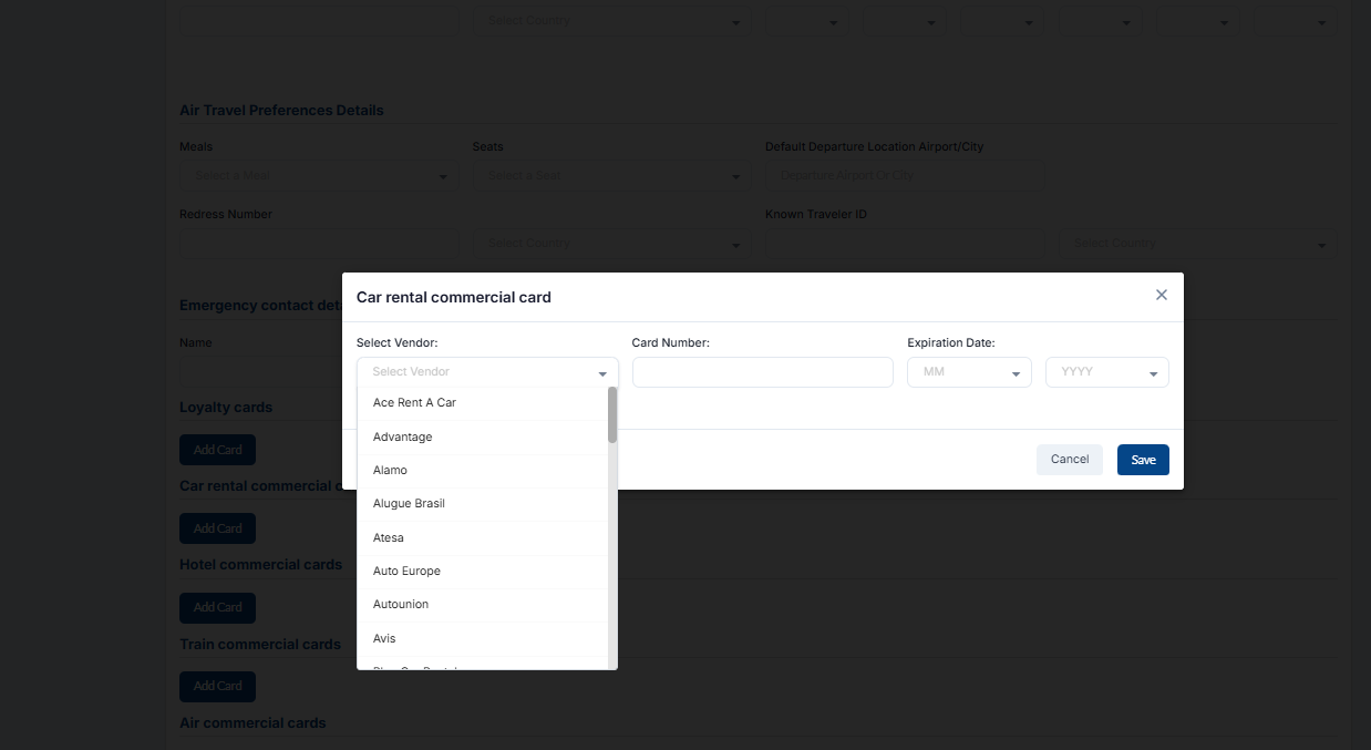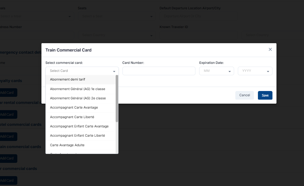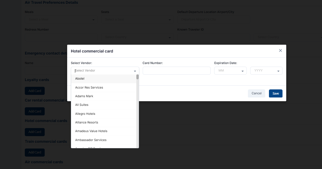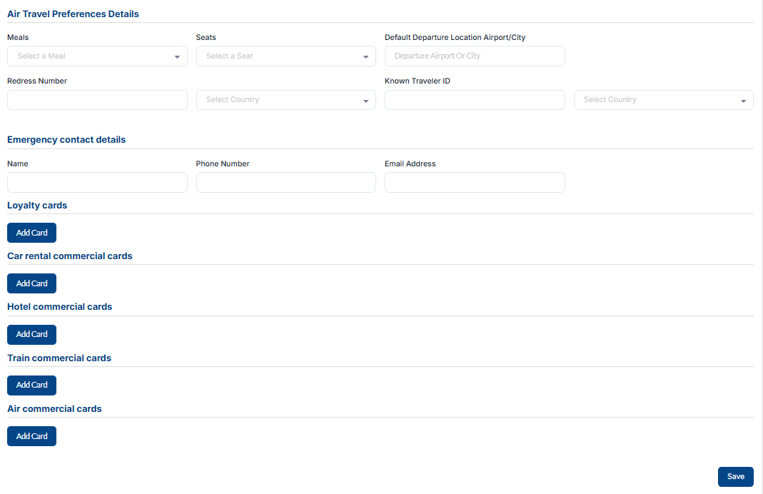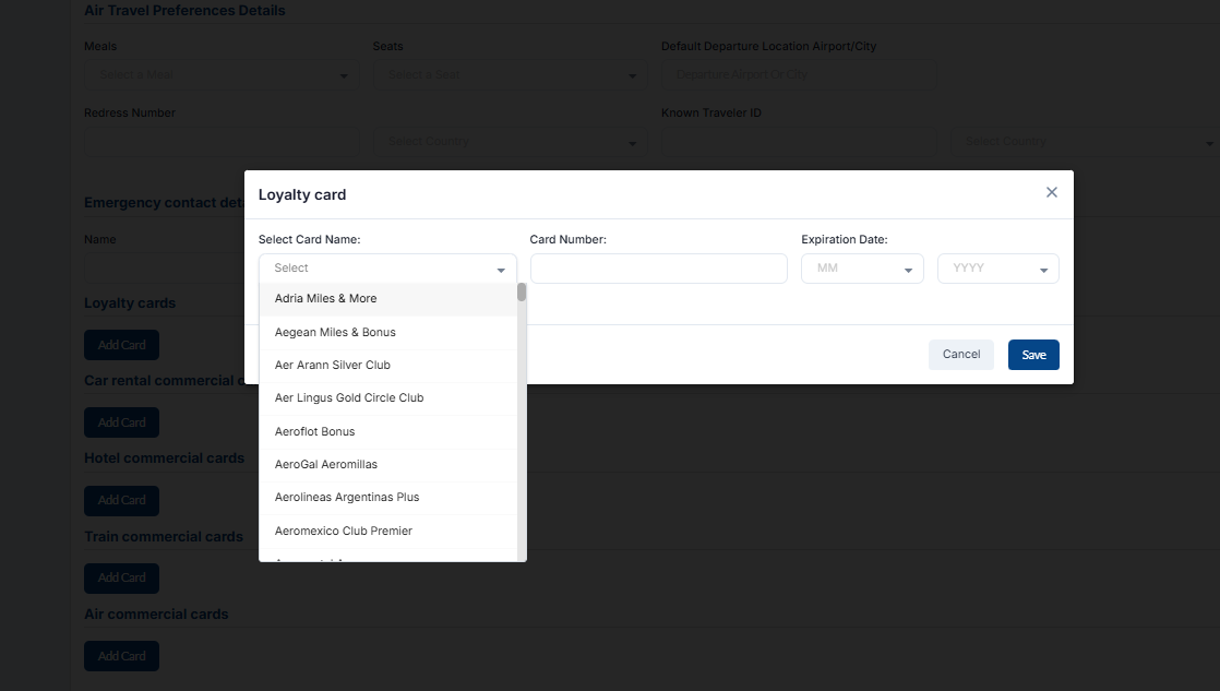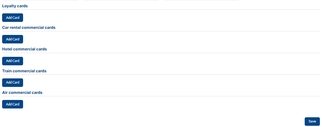 Under the loyalty cards section, you can add loyalty cards, loyalty cards for cars and hotels, and commercial cards for air and train. Loyalty cards are a marketing strategy that rewards customers for their repeat visits and purchase.