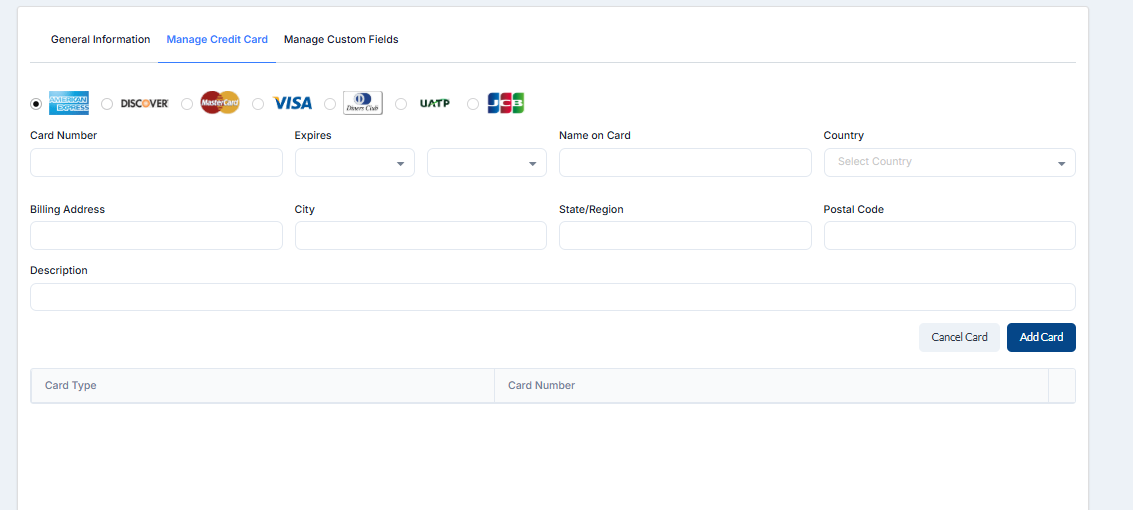 Here you can add your credit cards. You can add more than one. First, you need to select type of the credit card and then input the credit card information. Also, you can add the description for the credit card.