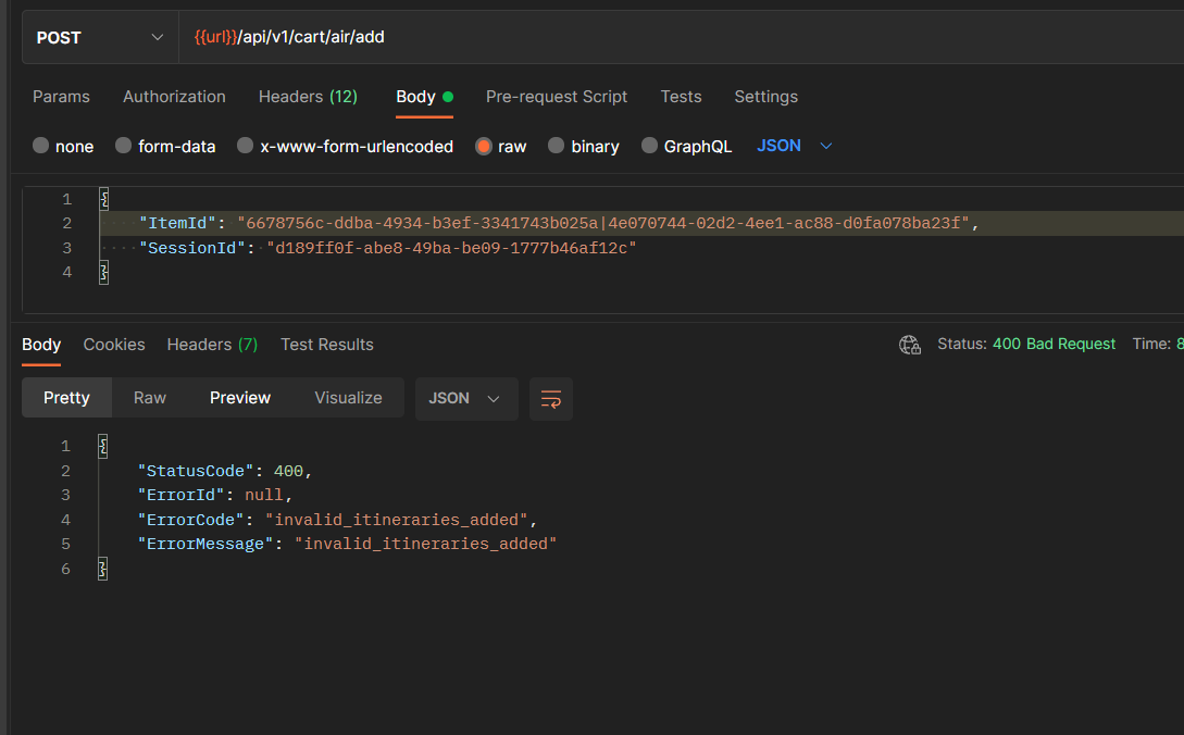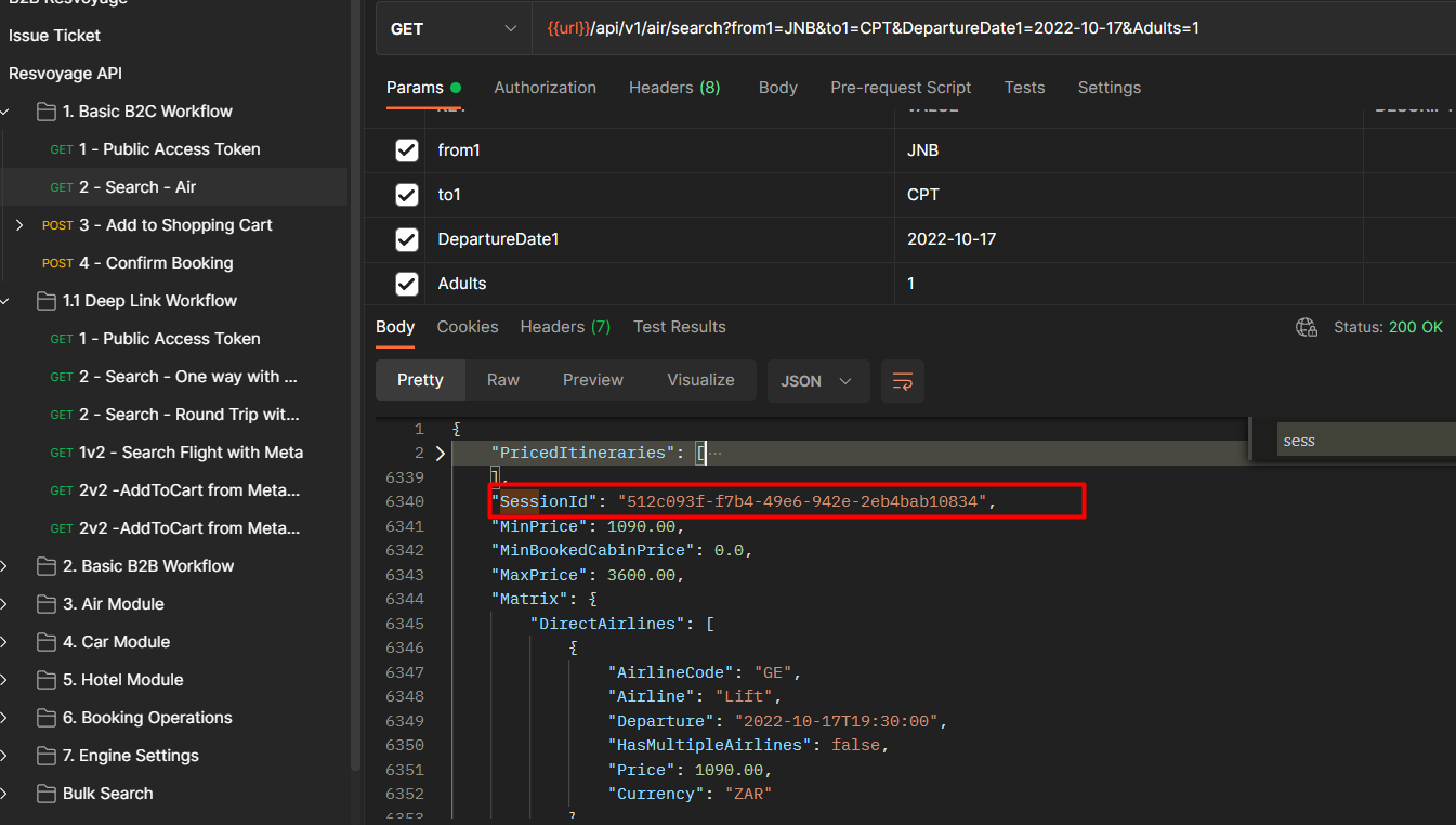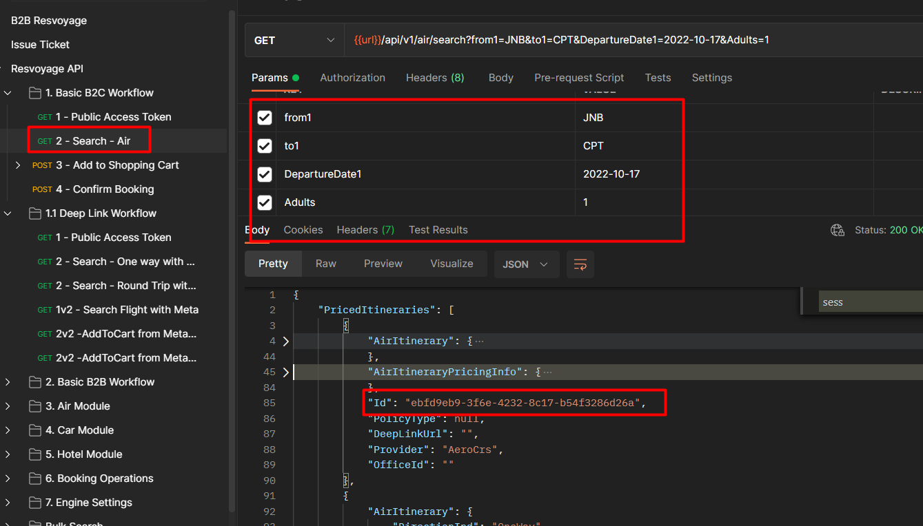 - You can do the search and in the response, you will receive the flights from AeroCRS or FlySafair. You should take ItemId and SessionId, copy them and paste them into the method for adding the itinerary to the shopping cart: