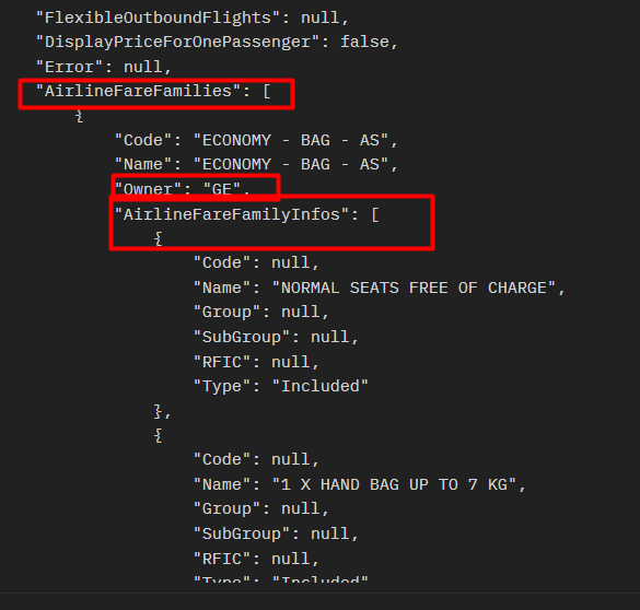 - In the response under the parameter "AirlineFareFamilies" you can find the fare family display for a specific airline under the parameter "Owner":