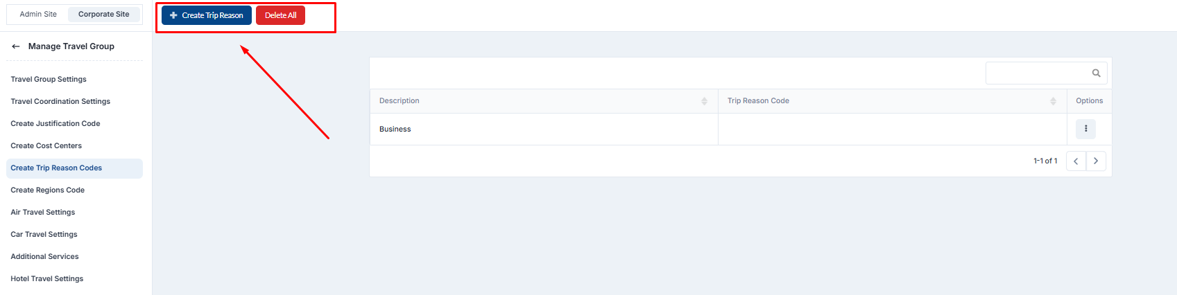 Corporate Site → Edit Travel Group → Create Trip Reason Codes on the left panel.
