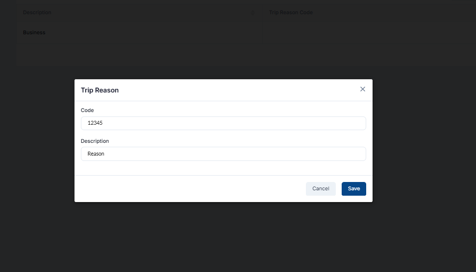 After clicking on the "Create Trip Reason Codes" tab, the system will present you with the trip reason panel:
