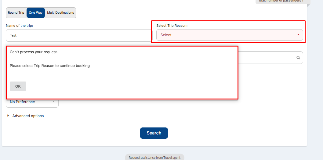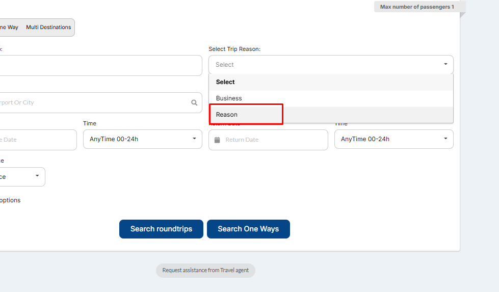 Before initiating a search on the booking engine, in this case, we would be required to select the right trip reason before initiating a search request.
