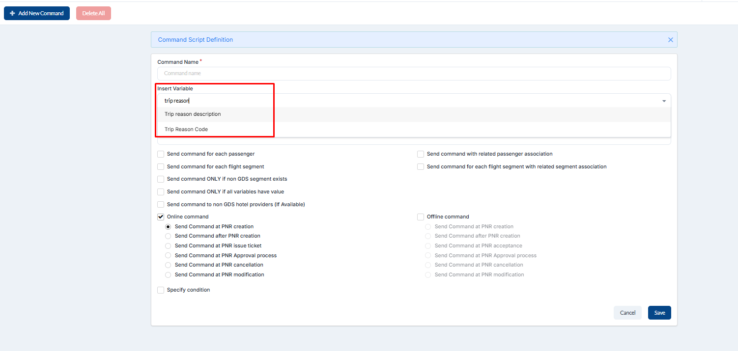 Additionally, the traveler picks the trip reason on the booking engine and the code will be sent in the remark if it is created on the travel group and in the command builder.