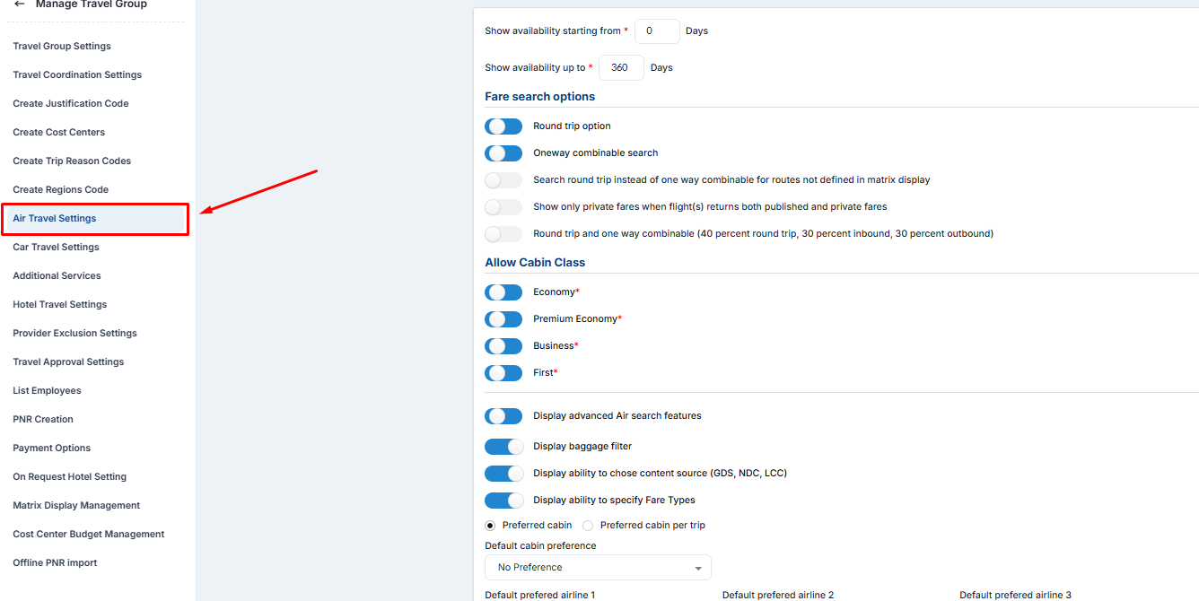 This part of the corporation's travel group settings consists primarily of the options for air travel specifications such as availability date ranges, fare search options, allowed cabin classes, as well as the options to enter your negotiated fare codes among other settings.