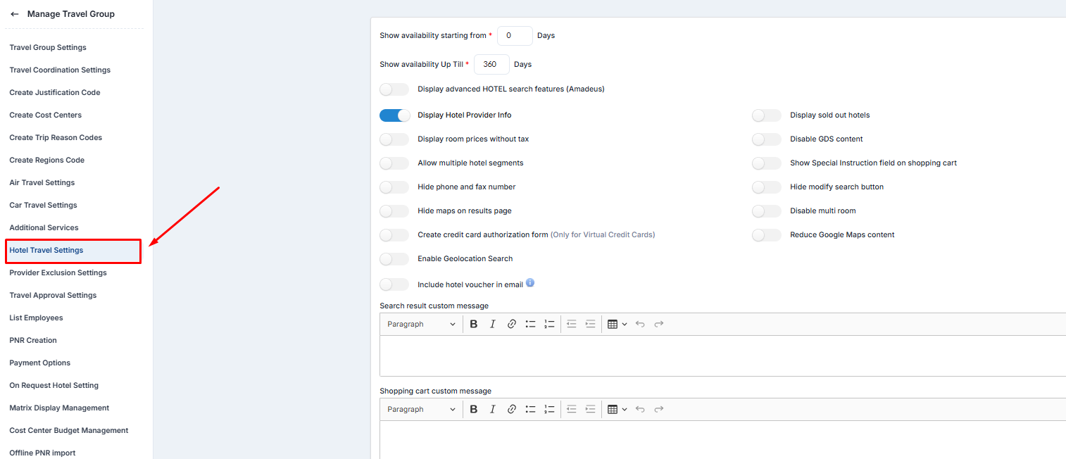 This part of the corporation's travel group settings consists primarily of the options for hotel travel specifications, such as availability date ranges as well as the options to enter your special rate codes, among other settings.