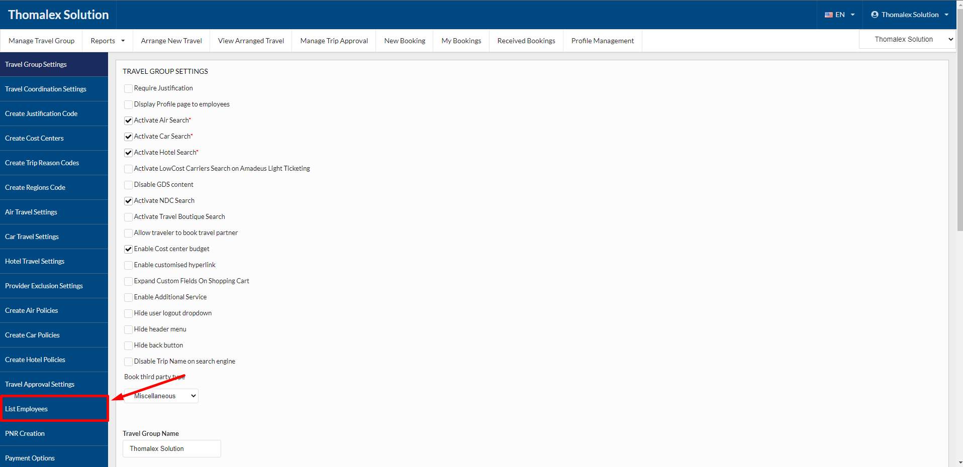 Image No.1 Location of the "List Employees" tab in the travel group settings