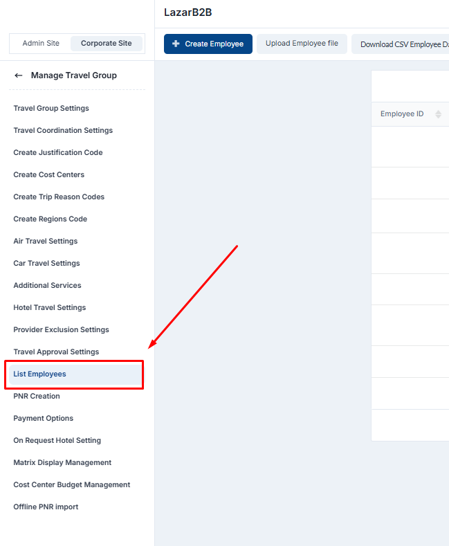 Select your corporate website → Corporate Site → Edit Travel Group → List Employees on the left side