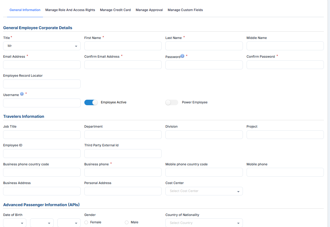 Create Employee | Once clicked, the panel for employee creation will open up with two available tabs. General Information Presents a panel where employee information is specified. Next to the regular personal information, you are able to specify Frequent Flyer Program information, Air Commercial Cards as well as Car and Hotel preference details. Note that the fields with (*) asterisk signs are mandatory. Manage Role and Access Rights For additional references regarding roles and their management please refer to the following link - Create a Corporate Employee |