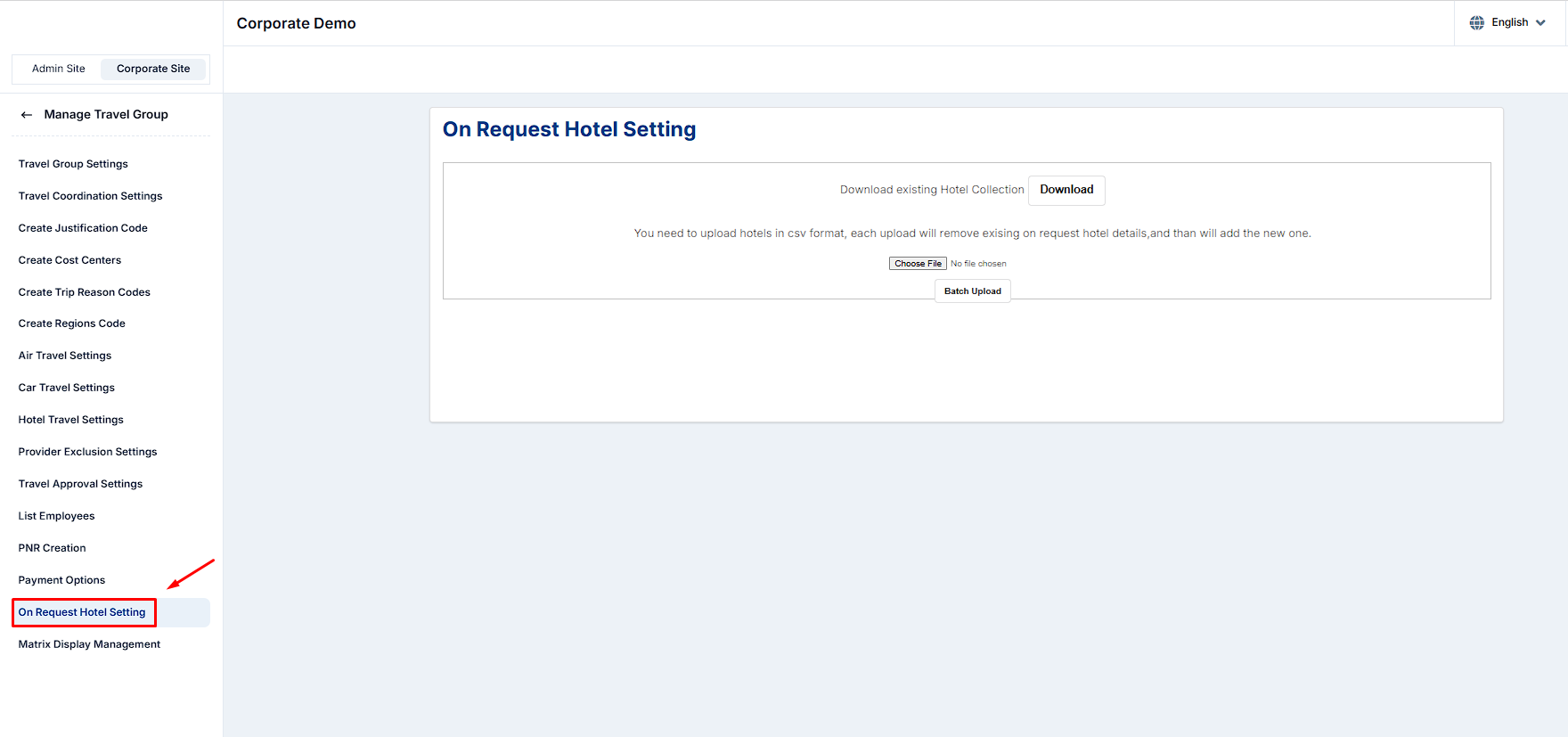 Corporate Site → Edit Travel Group → On-Request Hotel Setting on the left side