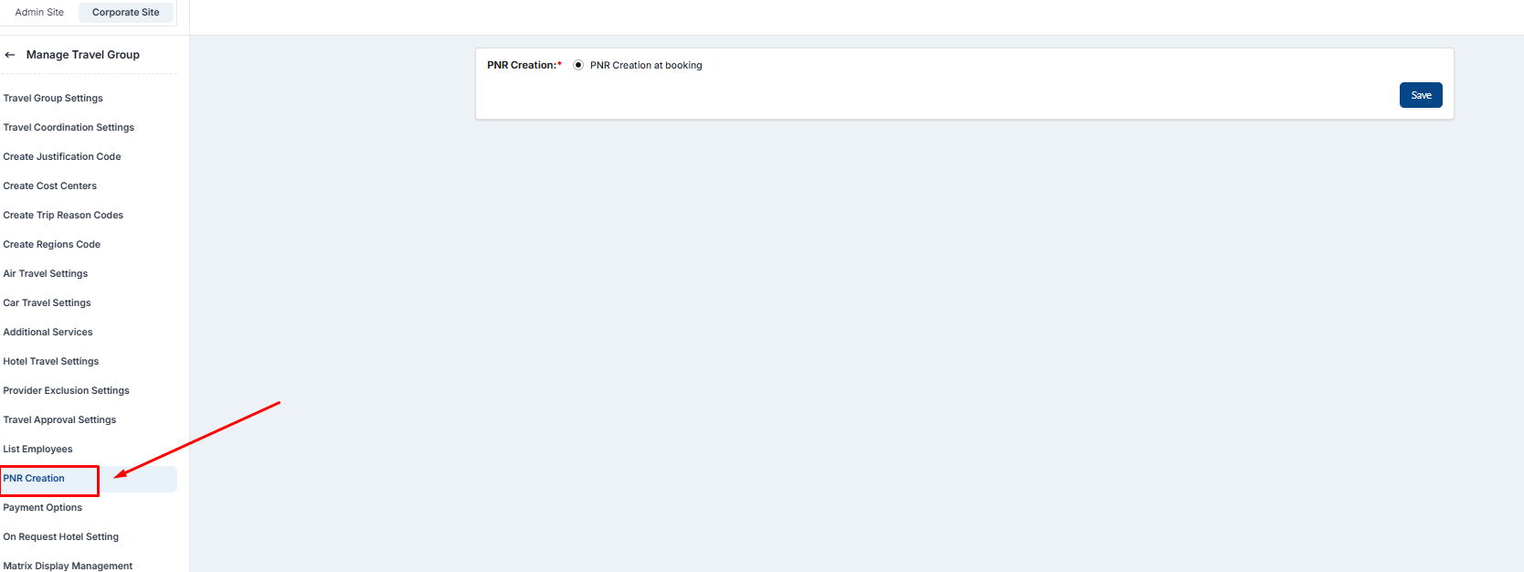 Corporate Site → Edit Travel Group → PNR Creation on the left side