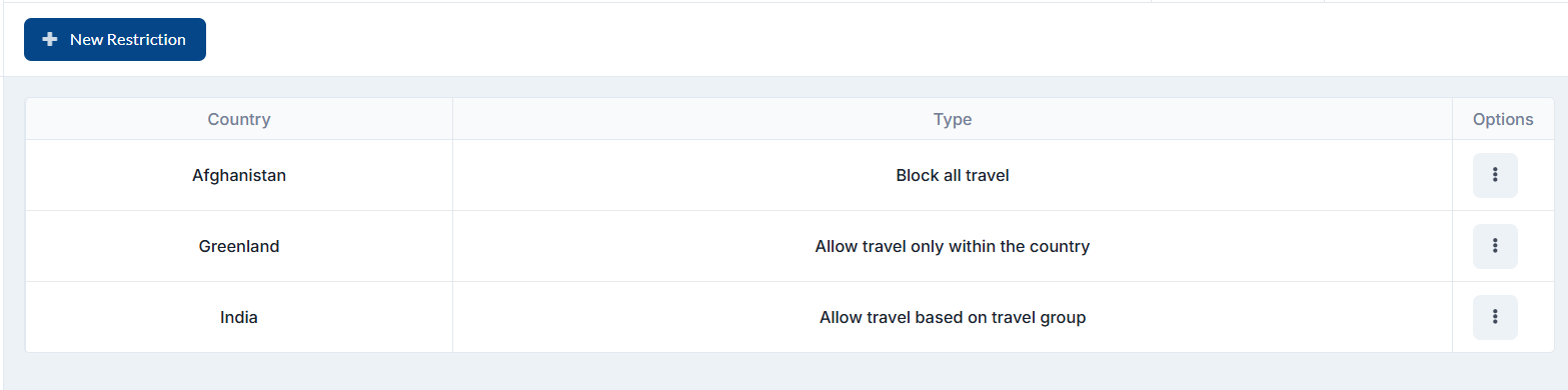 This functionality gives an ability to define different travel restrictions levels based for countries. This is very important for companies and employees who are travelling in a high-risk countries.