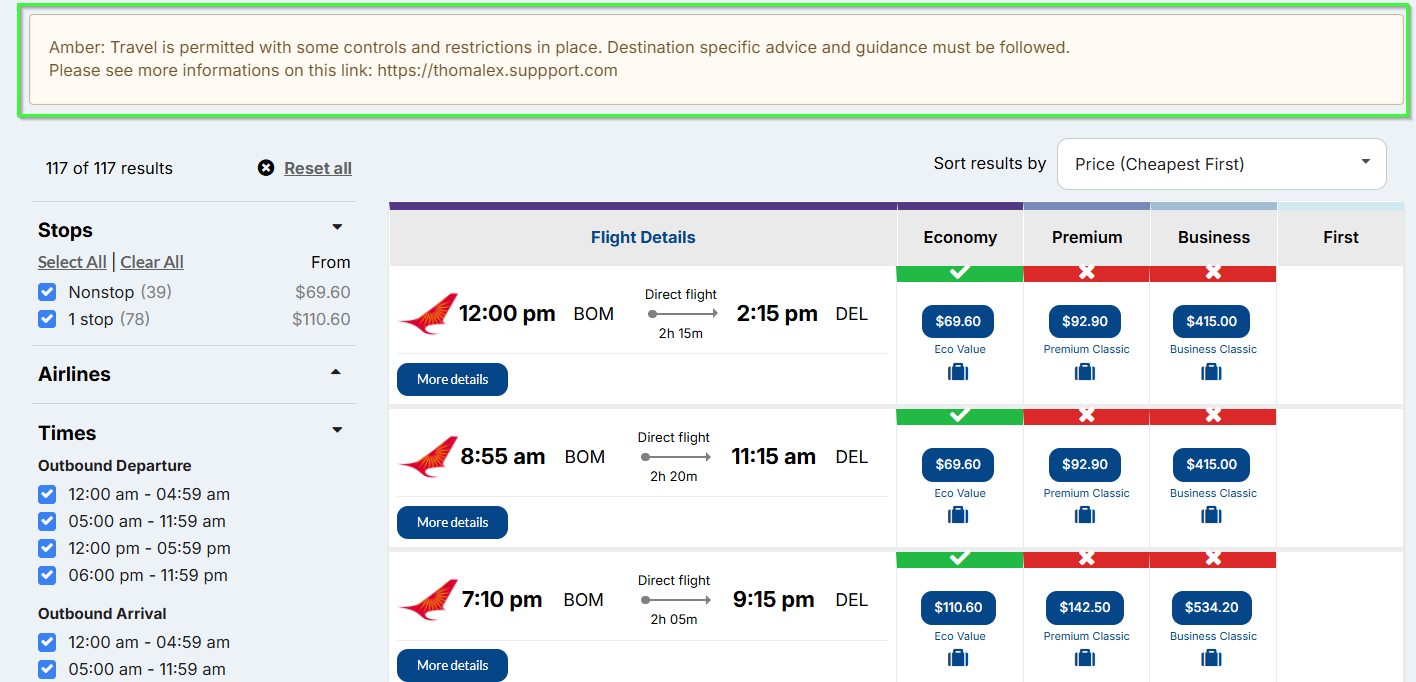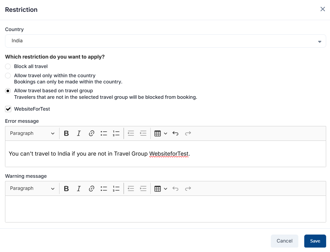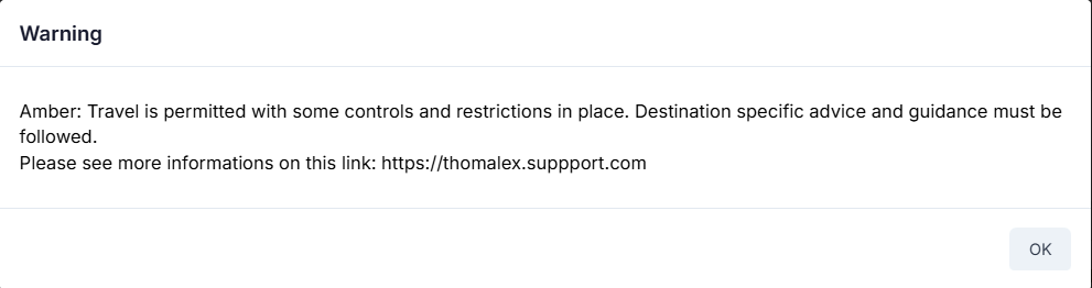 | Warning Message | Message that will be shown to travelers that are allowed to travel but they need to follow the be aware of the message that is entered. |