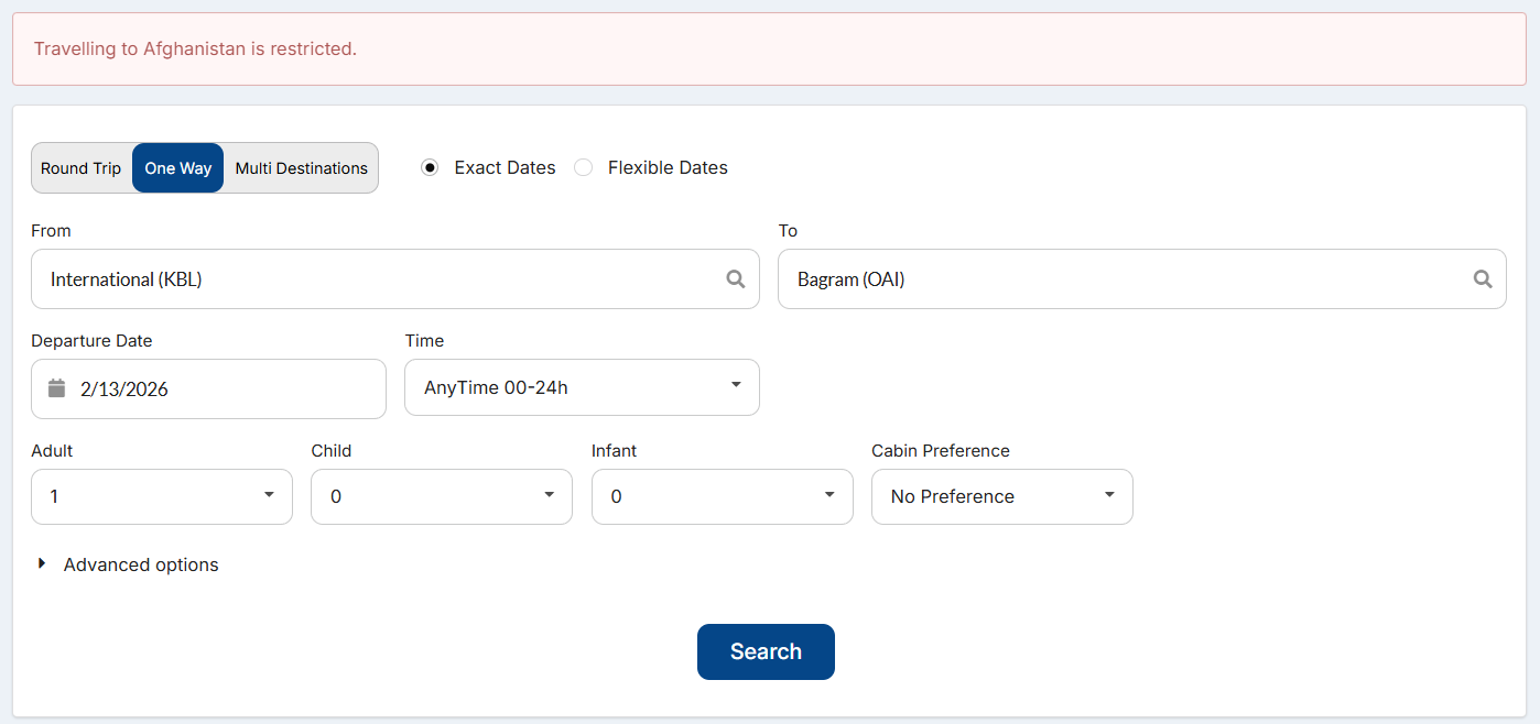 Example: If Spain is selected, you won't be able to perform a search from Berlin to Madrid, you will receive an error for that restriction. But you will be able to perform a search and book a flight on relation Barcelona - Madrid.
