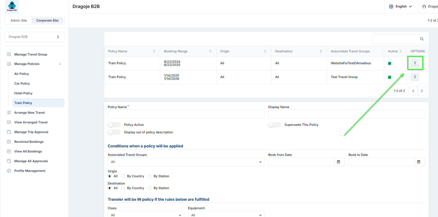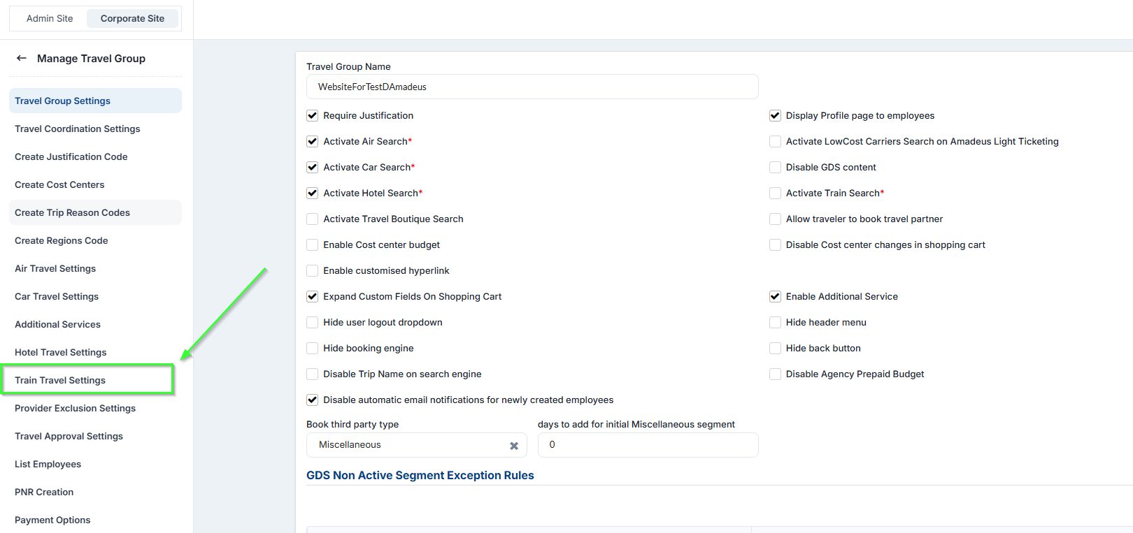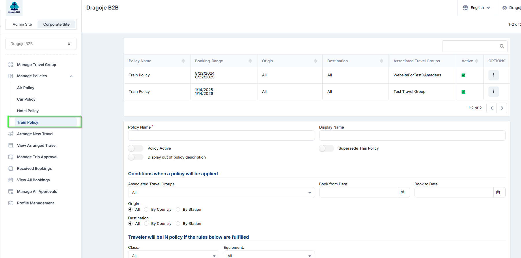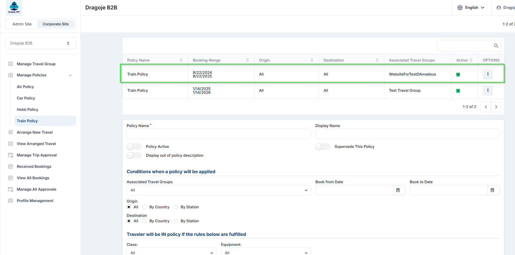 Corporate Site → Edit Travel Group → Train Travel Policies on the left panel.