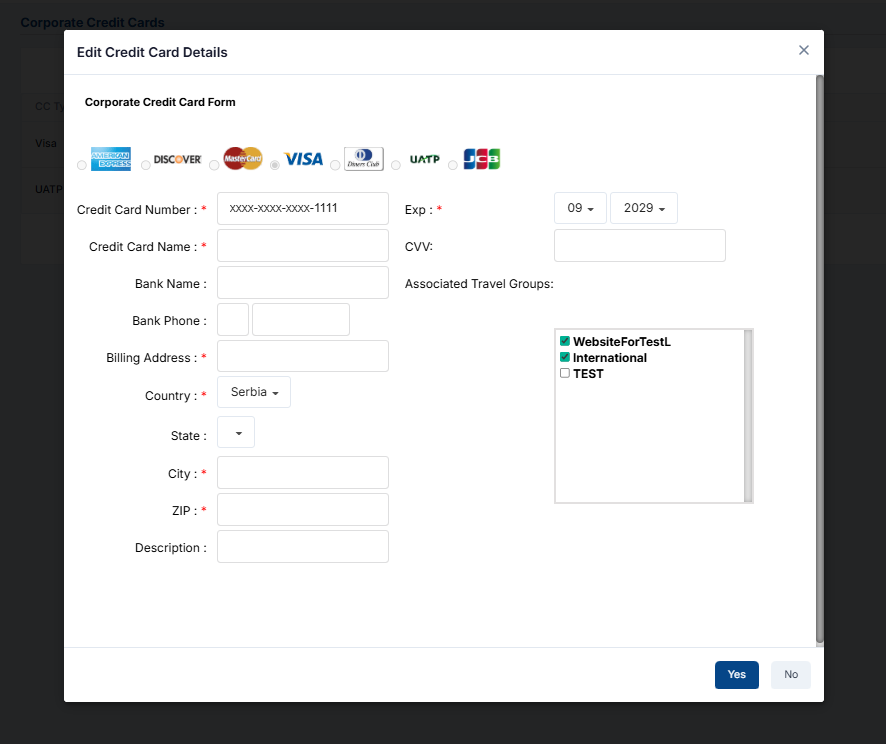 Corporate Site → Edit Travel Group → Payment Options → View Corporate Credit Cards → Create Corporate Credit Card
