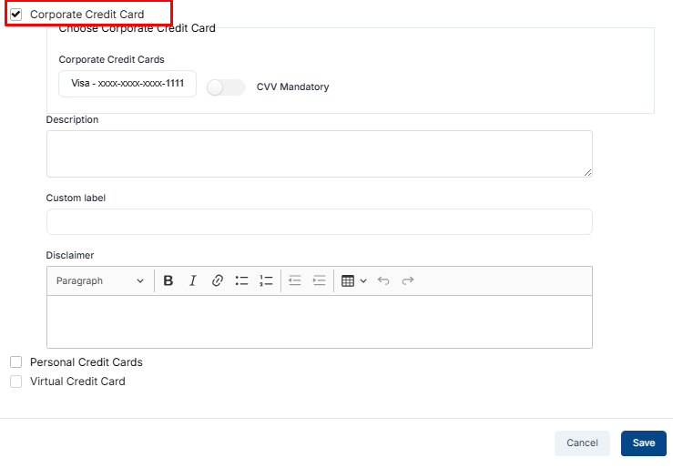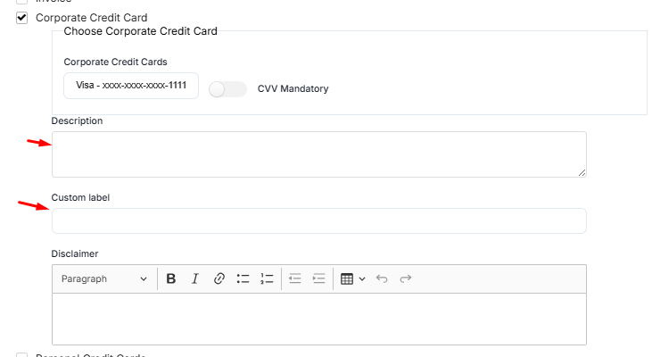 As seen in the image below, two fields where you can specify the description for corporate credit card and a custom label will be available:
