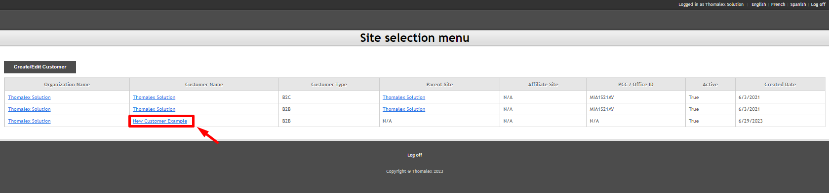 Now that the new customer has been created, proceed by selecting the "Back to Site Selection Menu" button: