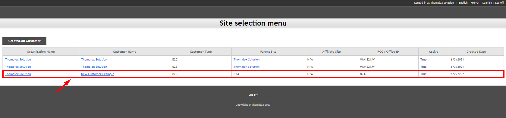 To proceed with creating a B2C or B2B website, click on a newly created customer: