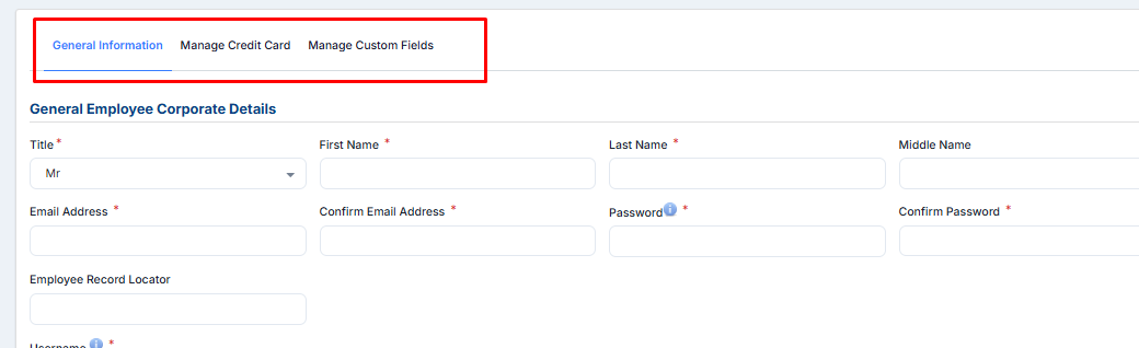 General Employee Corporate details allow you to change your general information such as title, name, username, email, and password: