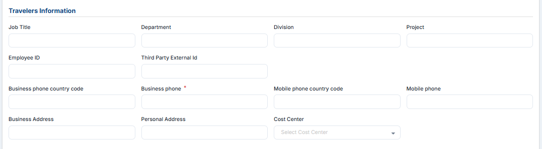 General Information can be divided into 6 sections General Employee Corporate details, Administrative Details, Advanced Passenger Information (APIs), Air Travel Preferences Details, Emergency Contact Details, and Loyalty cards.