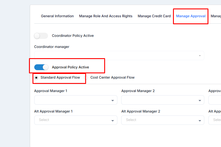 The cost center approval flow works the same way; it is just related to cost centers created in the "Create cost center" wizard.