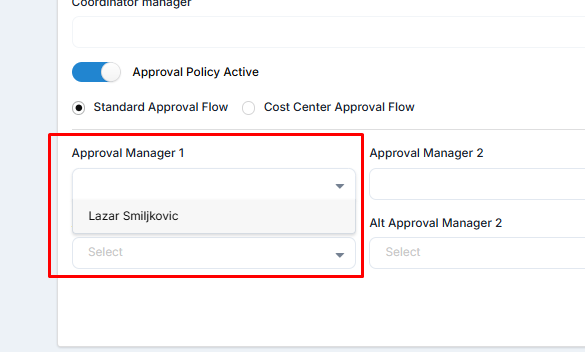 "Approval manager" is a multi-select list, so the employee can have multiple approvers. The multi-select list contains all approvers that exist in the travel group. If there are no employees with the role "Approver," the list will be empty.