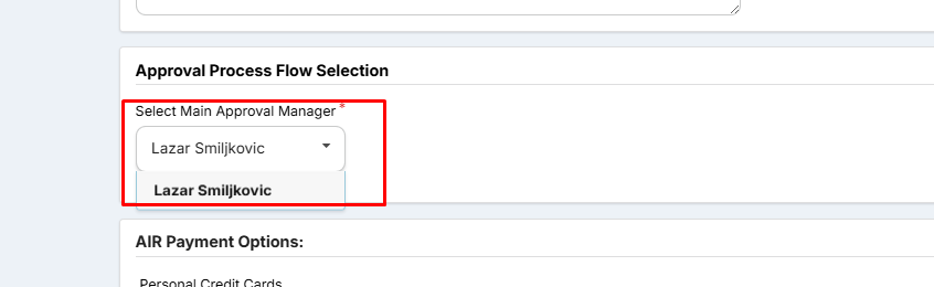 Image no.8 Selecting Level One Approval Manager Before Requesting Approval From a Travelers Perspective