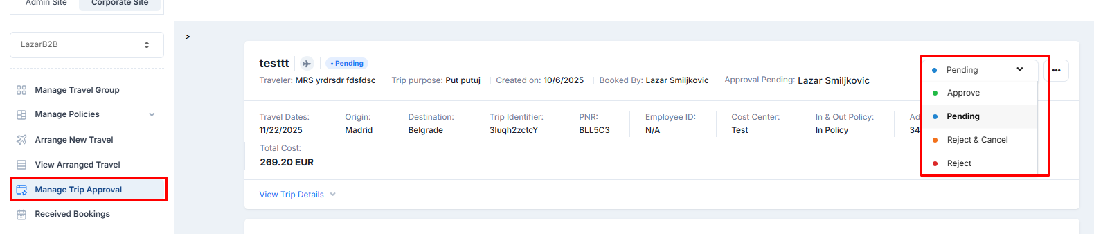 Corporate Site → Edit Travel Group → List Employees → Edit the profile for whom the approval policy needs to be activated: