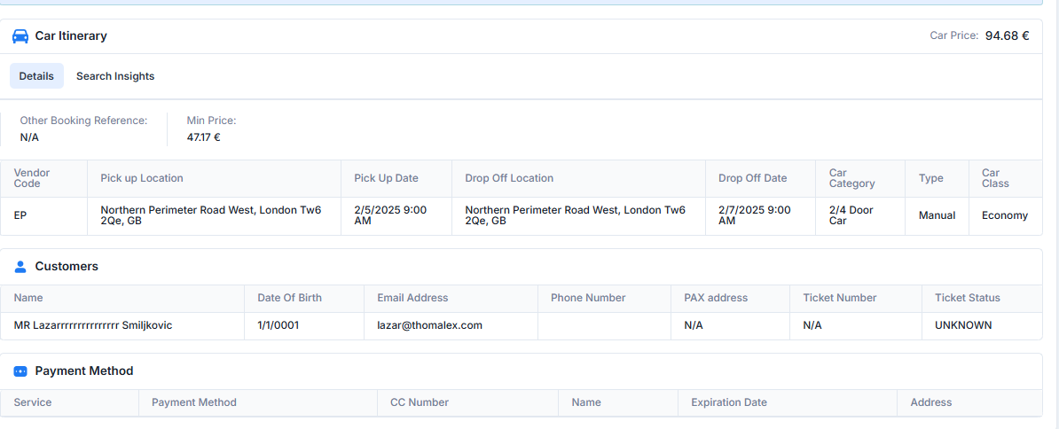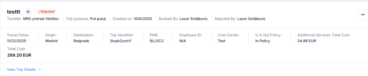 Selecting the "View Trip Details" below any approval request will present to the approval manager all information regarding the booking request in question. The example, created for the booking we used in this example can be seen below:
