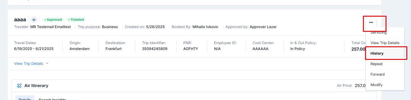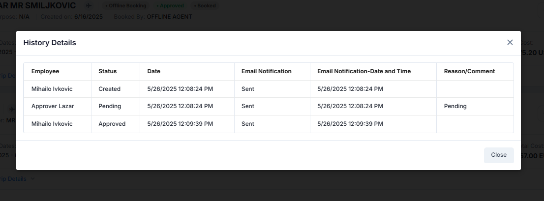 At any time by first clicking on "View Trip Details" and then "History," you will be able to see the past activity of the approval request as seen in the example image below: