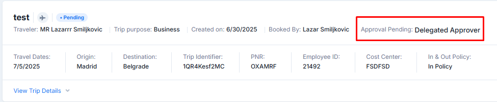 Now that the Approval Request is sent to the approver and alternative approver - the approver once logged in will first need to click on the "Manage Trip Approval" and the pending request will be presented as seen in the image below: