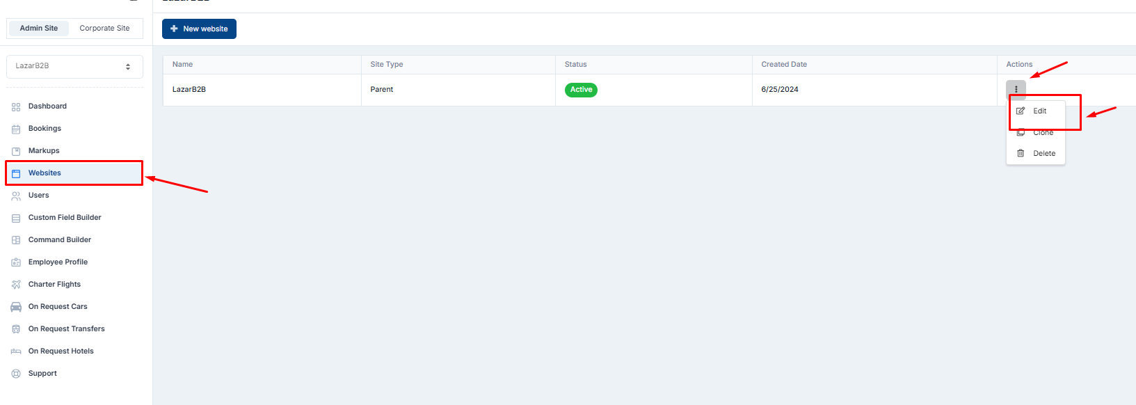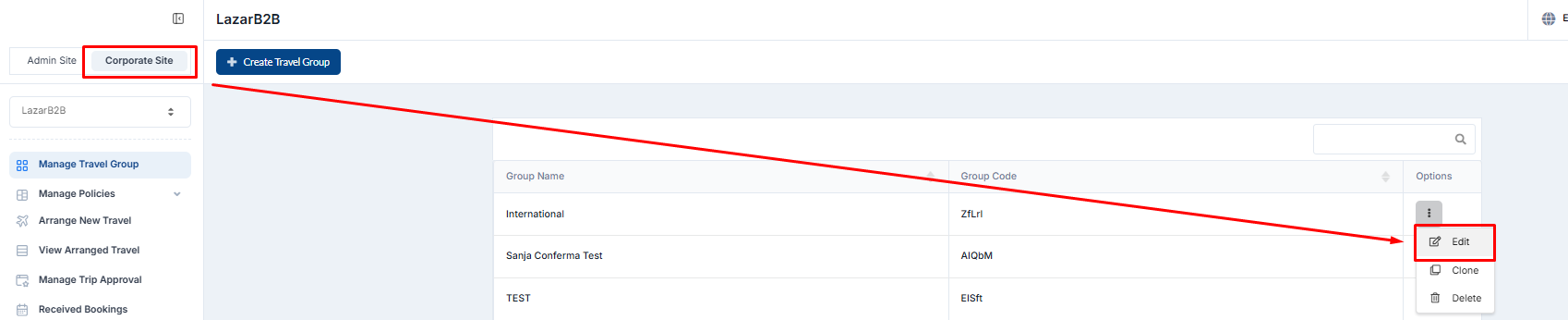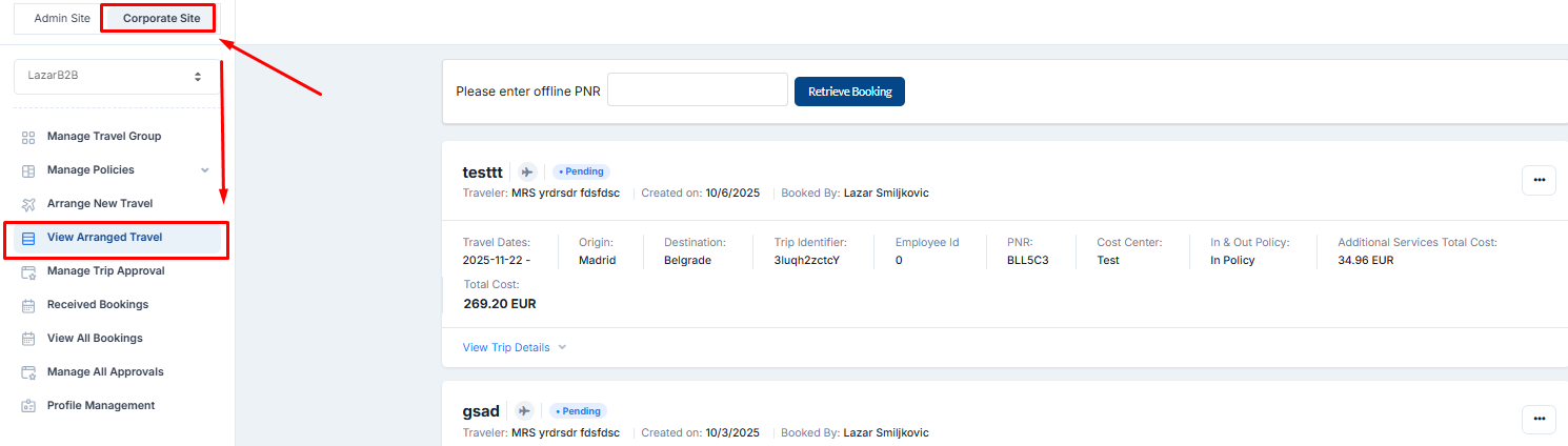 Admin panel → Corporate Site → View Arranged travel