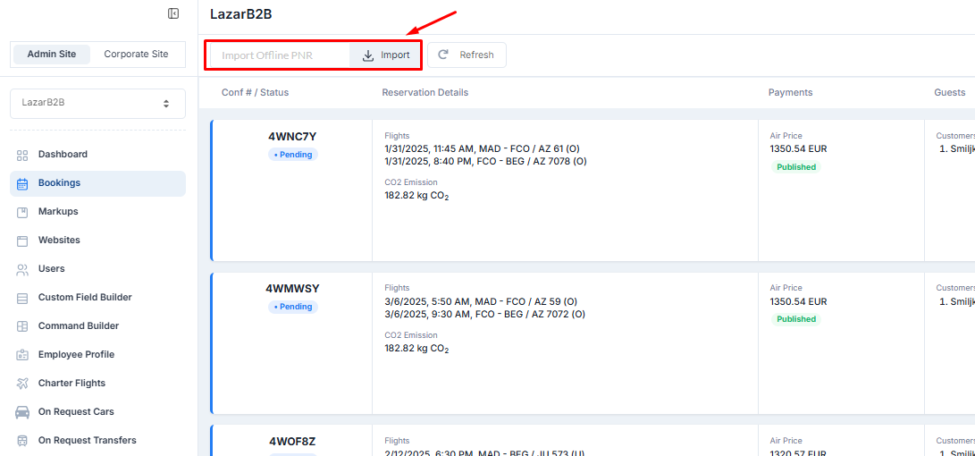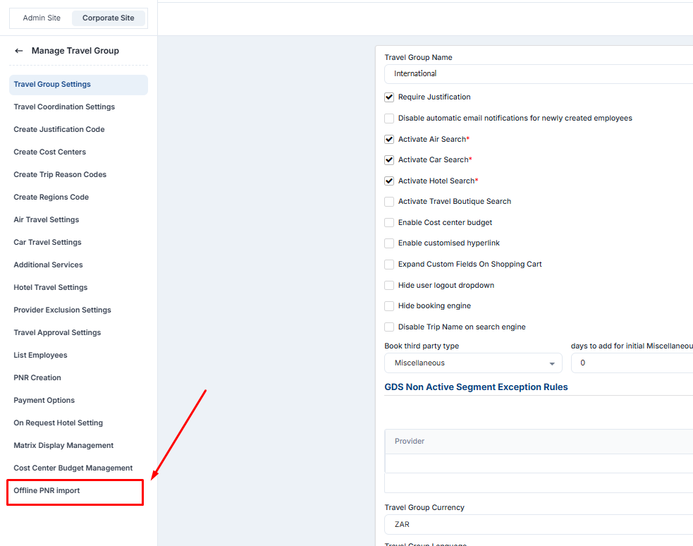 Admin panel → Corporate Site → Edit Travel Group → Offline PNR Import