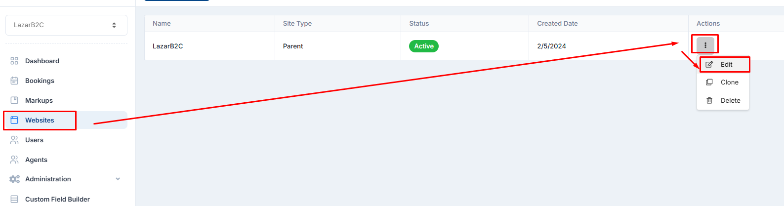 - Choose the website for which you want to set up the logo and on the right icon click on Edit Website