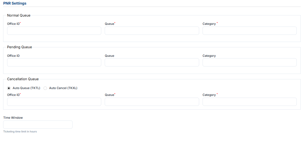 In the next part of the settings, PNR settings, you will set on which Q reservation created by using this Office ID will be placed. The normal and cancelation queue are mandatory. Also, you can set the ticketing time limit. If the ticketing time limit provided by the airline is less than the one that you set here, the ticketing time limit from the airline will be applied:
