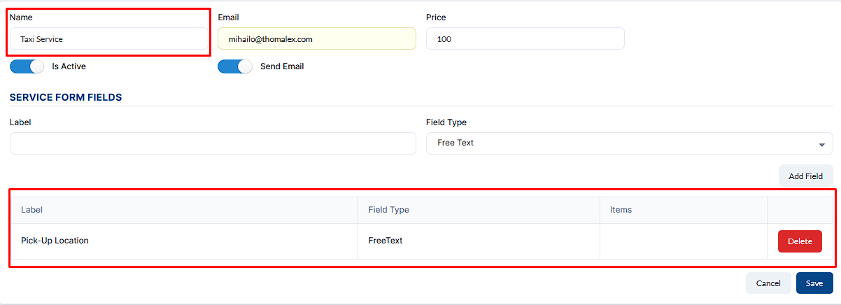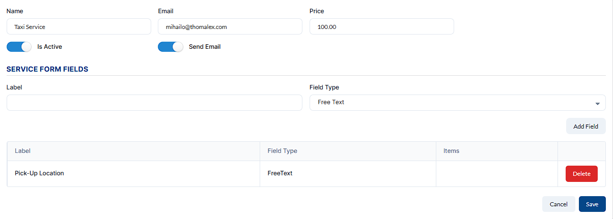 | Label | This will be the name of the field we choose. For example, as we have already named the service "Taxi Service", we can name the Label as "Pick-Up Location". |