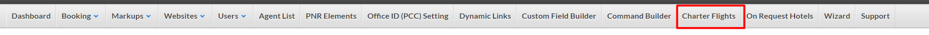 Upon the feature activation on the website backend, the new field "Charter Flights" tab will be displayed in the administration menu.