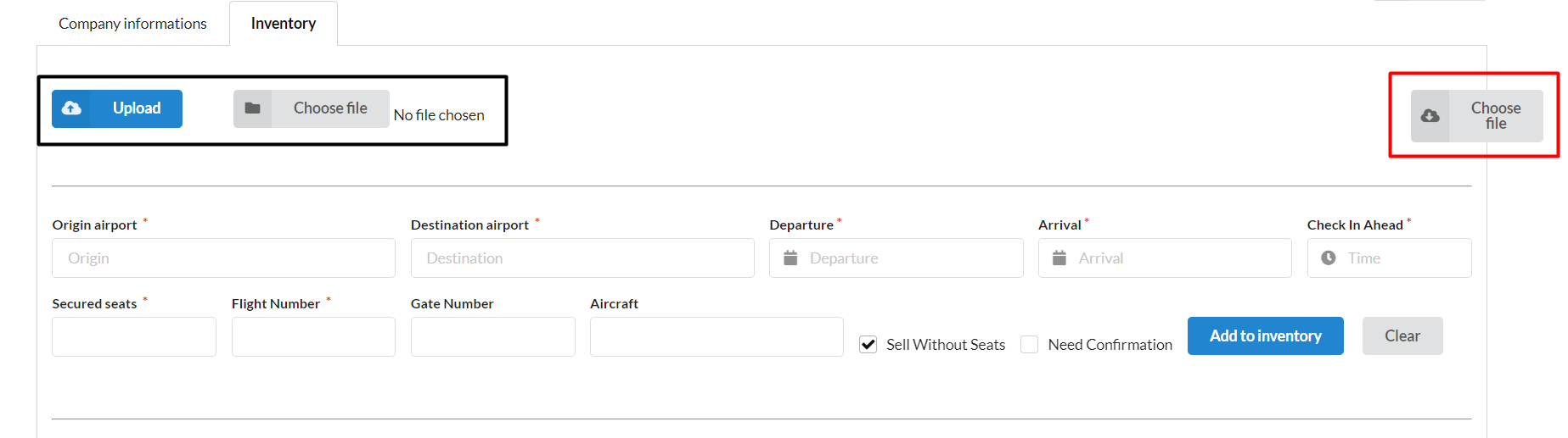 | Secured Seats | Number of secured seats. This field is mandatory. Unless the "Sell Without Seats" option is selected, after every booking, the number of available seats will decrease depending on the number of seats sold. Once the inventory reaches "0" the flight will no longer be visible in the search. |
