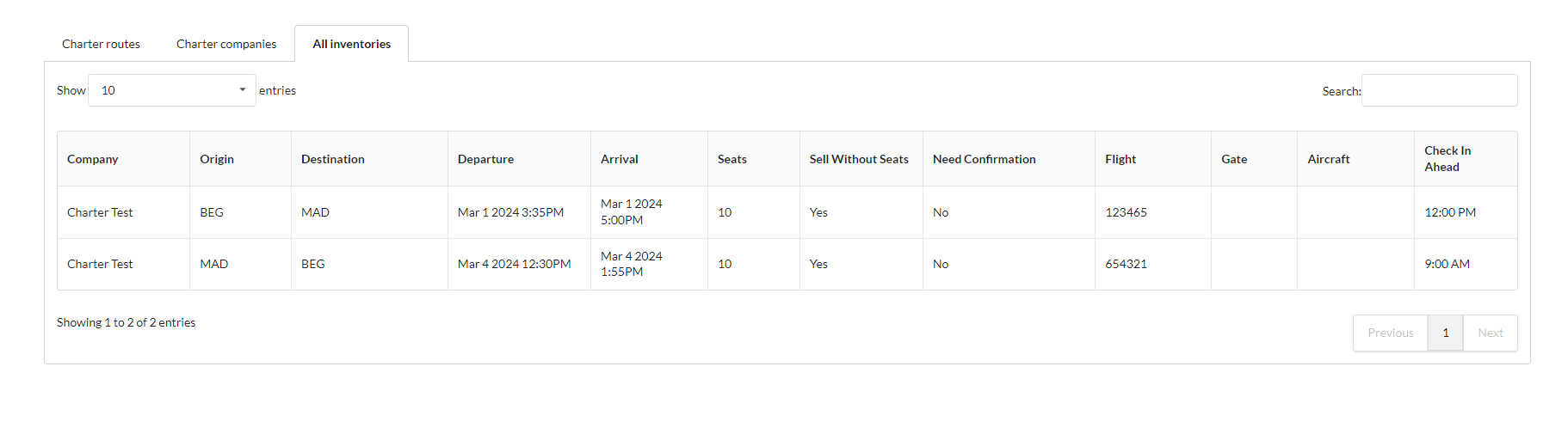 To have a roundtrip option for a charter flight, it's necessary to create the inventory for both directions, as in the example below: