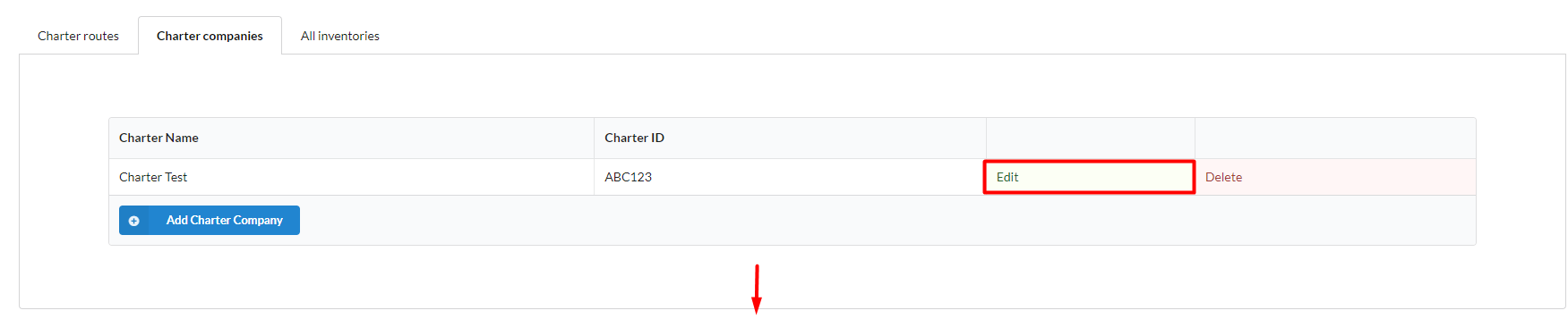 To edit the inventory for a certain charter company, navigate to the charter company, hit the "Edit" button, go to the inventory entry, and hit the "Edit" button on the entry.