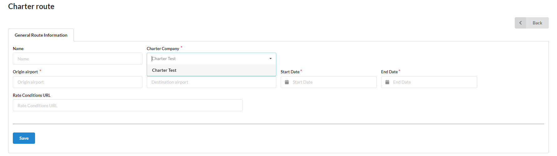 | Charter Company | A dropdown list from which you can choose the appropriate charter company for the route. The system will display all charter companies added to the system. This field is mandatory. |