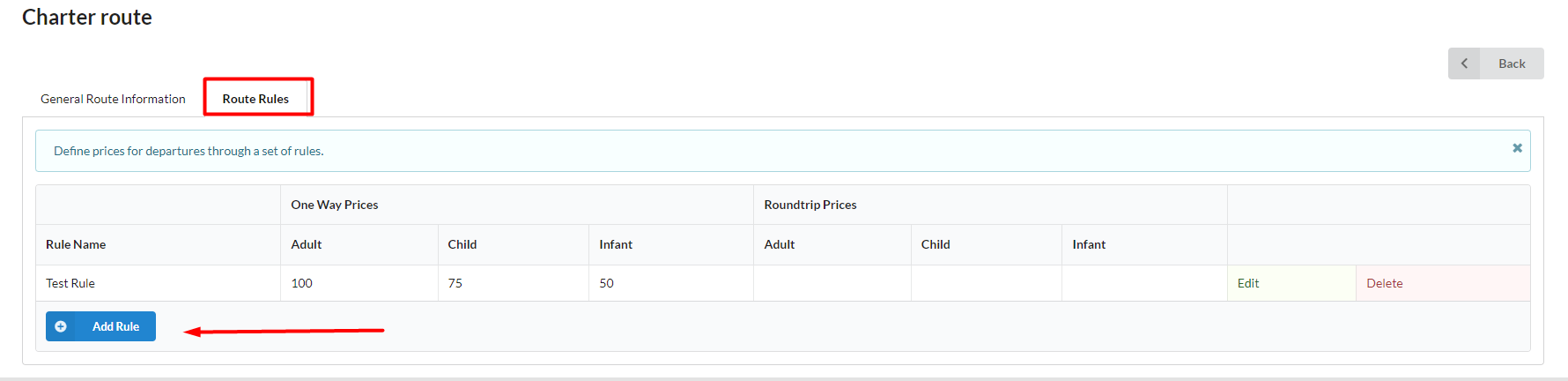 The next action is to create the charter route rules by editing the charter route created. A new option called "Route Rules" will be available. To create a new rule, hit the "Add Rule" button.