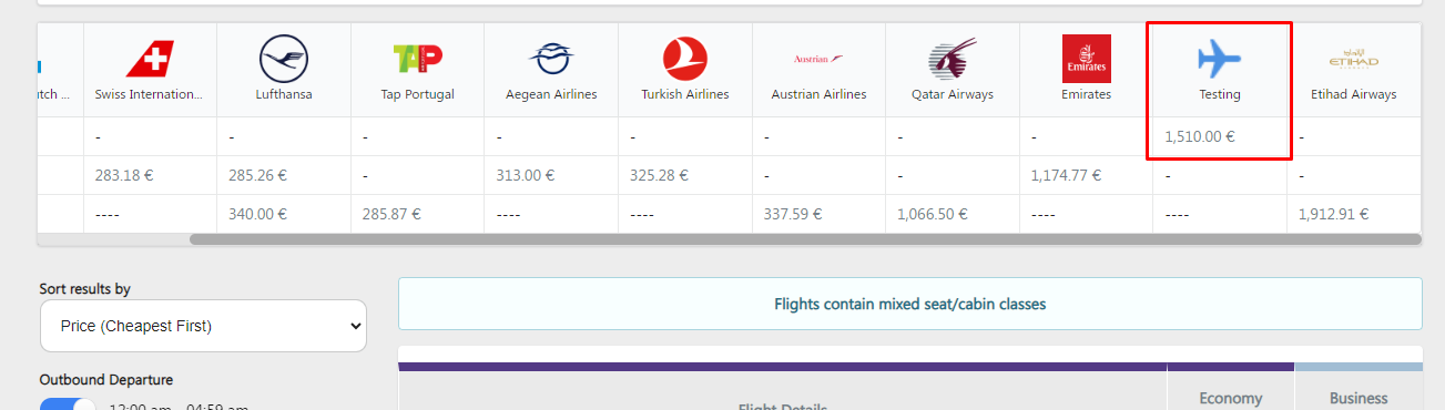 The first thing we can see after searching for our Charter Flights is that we can see our flight being shown with the information we have added in the Charter Flight options.