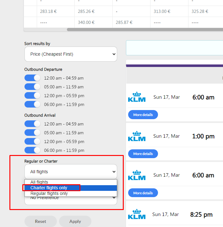 We can either select the flight from here, or we can scroll down and filter out to only show the Charter flights: