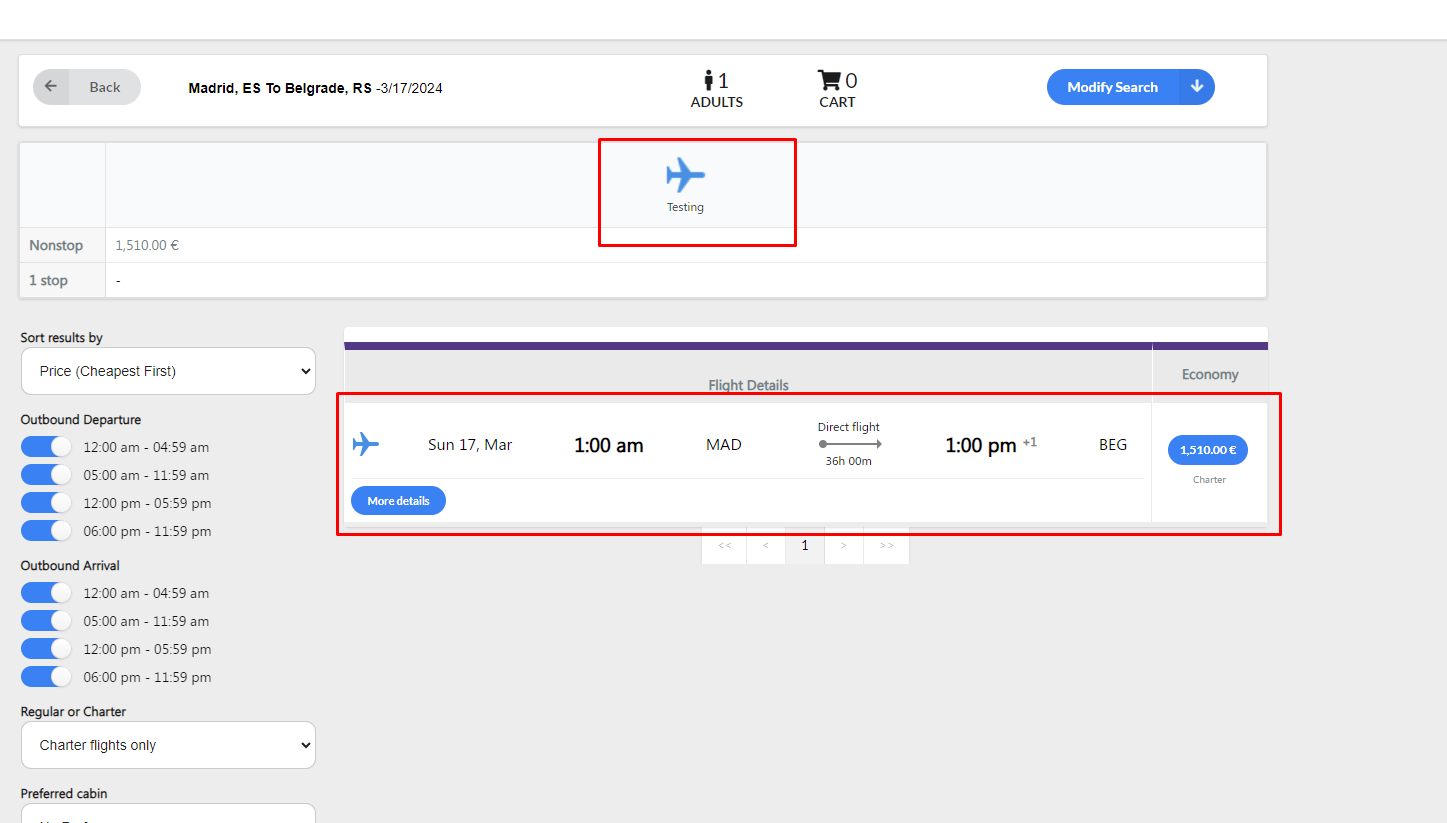 After adding all of the relevant information, we will now see how these Charter Flights look like on the Booking Engine itself.