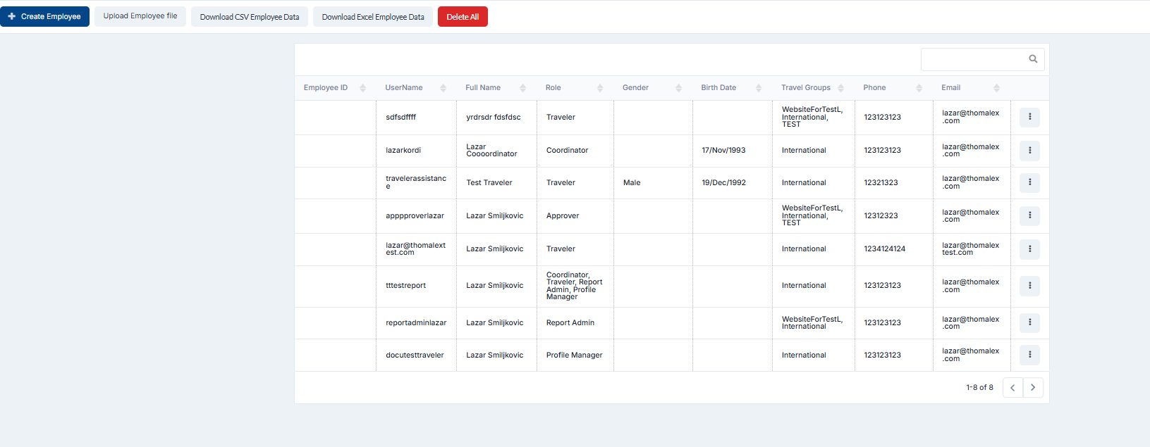 The Employee List at first sight lets us see the relevant information on every Employee in the Travel Group. Every of the Employees shown can be Edited or Deleted at any time by the Profile Manager.