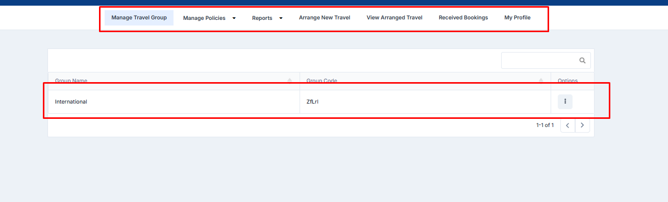 Right under the Header Menu, we can see a List of Travel Groups. The Travel Group Admin will be able to modify all of the existing Travel Groups in this list.